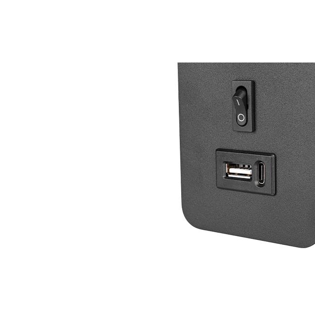 Veľkou výhodou lampy je integrovaný USB port typu A aj C, ktorý umožňuje pohodlné nabíjanie mobilného telefónu, tabletu alebo iných zariadení priamo z lampy, bez potreby ďalších adaptérov.