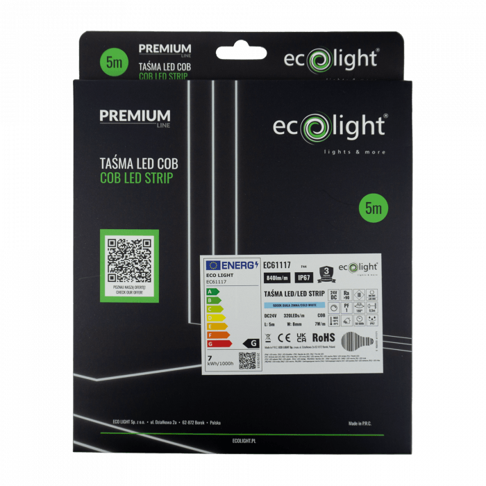 COB technológia (Chip On Board) zabezpečuje vysokú hustotu LED diód – až 320 diód na meter. Výsledkom je homogénne svetlo bez prerušovaných svetelných bodov, čo je výhodné najmä pri dekoratívnom osvetlení alebo pri montáži do hliníkových LED profilov.