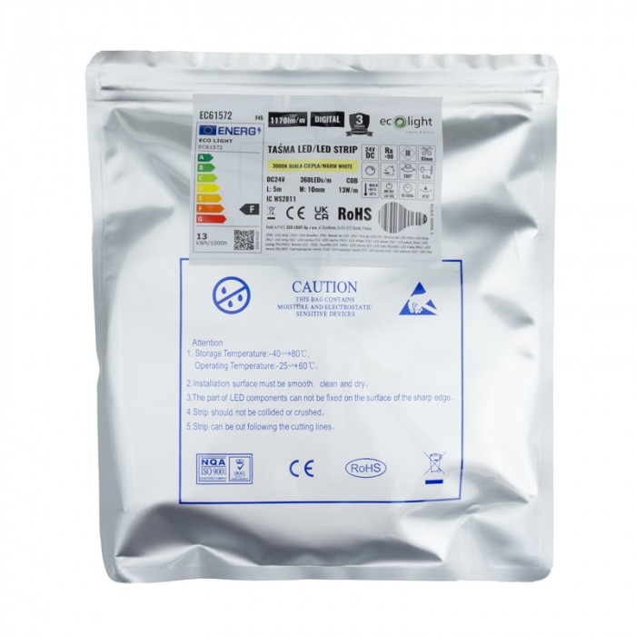 Použité napájanie 24 V DC zabezpečuje stabilnejšiu prevádzku a minimalizuje pokles napätia pri dlhších úsekoch LED pásu. Výkon 13 W na meter poskytuje svetelný tok približne 1170 lúmenov na meter, čo zaručuje vysokú účinnosť osvetlenia približne 90 lm/W.