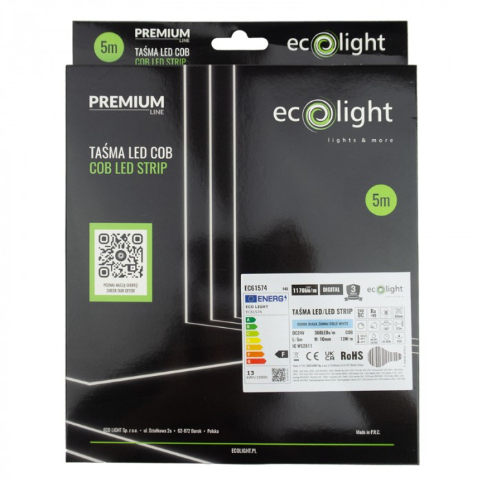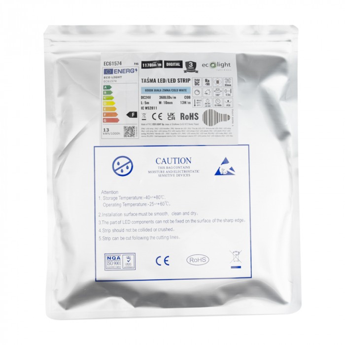 Pásik obsahuje až 360 LED diód na meter, čo zabezpečuje dokonale homogénne svetlo bez prerušovaných bodiek typických pre klasické LED pásiky. Studená biela farba svetla 6000K poskytuje jasné a kontrastné osvetlenie vhodné najmä do pracovných priestorov, kuchýň, dielní alebo vitrín.