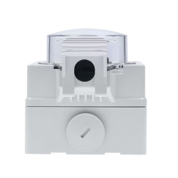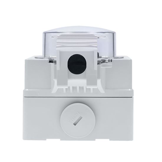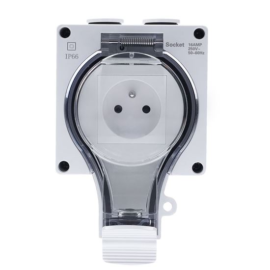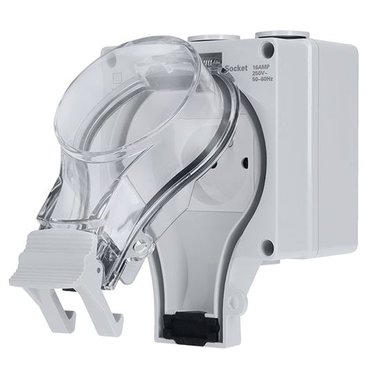 Zásuvka disponuje priehľadným uzatvárateľným vekom, ktoré umožňuje vizuálnu kontrolu bez nutnosti otvorenia. Veko je možné uzamknúť visiacim zámkom, čím sa zvyšuje ochrana proti neoprávnenej manipulácii. Predĺžený kryt zároveň chráni pripojený kábel a uľahčuje zatváranie.
