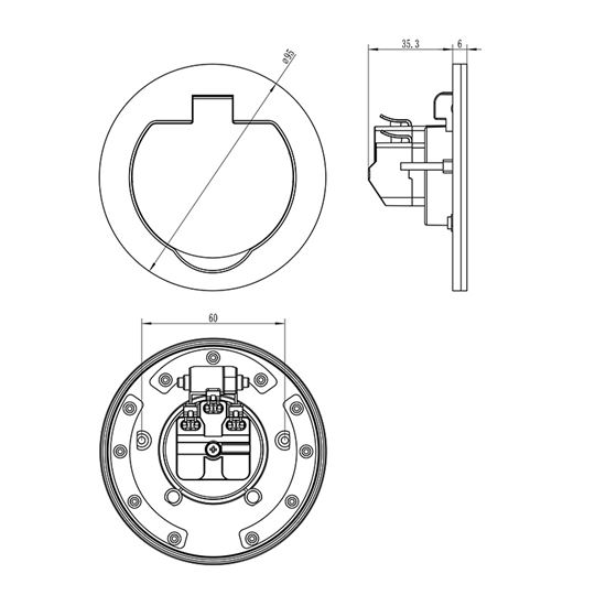 Vrchný kryt zásuvky je vyrobený z odolnej zinkovej zliatiny (brúsený hliníkový vzhľad), ktorá zabezpečuje dlhú životnosť, mechanickú pevnosť a ochranu proti korózii. Dizajn bez viditeľných skrutiek pôsobí čisto a profesionálne, pričom zároveň uľahčuje údržbu.
