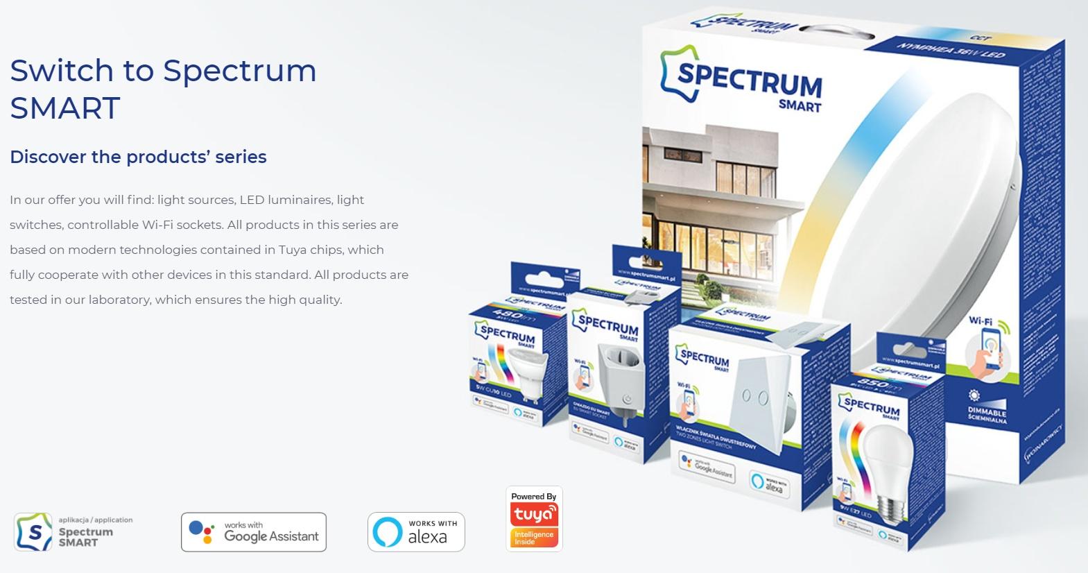 Spectrum SMART - v našej ponuke nájdete: svetelné zdroje, LED svietidlá, svetelné vypínače, ovládateľné zásuvky Wi-Fi. Všetky výrobky v tejto sérii sú založené na moderných technológiách obsiahnutých v čipoch Tuya, ktoré plne spolupracujú s ostatnými zariadeniami v tomto štandarde. Všetky výrobky sú testované v našom laboratóriu, čo zaručuje vysokú kvalitu.