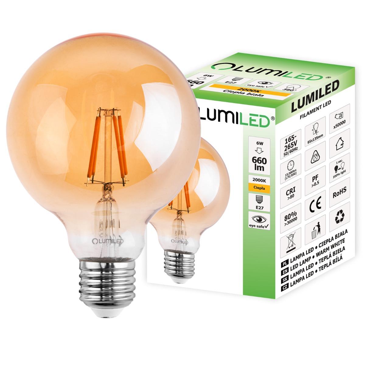 E27 DEKORATÍVNA LED FILAMENT G95 6W 2000K TEPLÁ 360° LUMILED GLOBE AMBER