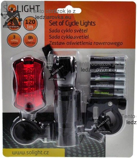 Sada cyklo svetiel, predné 3W LED + zadné 5x LED, 2x držiak, 5x AAA batérie-Solight