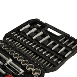 Sada nástrčných kľúčov (1/4", 1/2") v praktickom kufríku. Sada bude obsahovať aj početné príslušenstvo, vrátane predlžovačov, adaptéra, skrutkovača. Materiál: chróm-vanádiová oceľ. Puzdro: 39 cm x 29 cm x 8 cm.